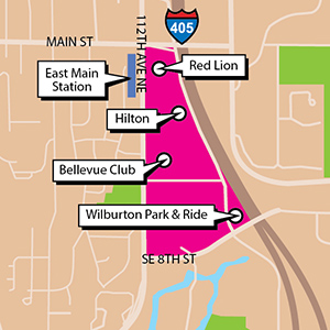 East Main Station will be near the southwest corner of Main and 112th Avenue Southwest, opposite the Red Lion Hotel and Hilton Bellevue. The transit oriented development (TOD) area extends south from Main, bounded by 112th and the freeway, to Southeast Eighth Street.