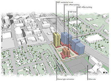 The family-run Wig Properties will likely be the first and most prominent player in redeveloping the north TOD site. It has assembled 15.5 acres: first paying $35 million for the older Red Lion in 2015; and then paying $84 million in 2016 for the newer, larger Hilton to the south.