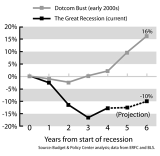 As this graph shows, state tax revenues for fiscal year 2011 — four years after the start of the Great Recession — were 14 percent below 2007 levels, after adjustment for inflation. By 2014, fully six years since the start of the current recession, revenues are projected to remain about 10 percent below pre-recession levels. By contrast, during the previous “dotcom bust recession” of the early 2000s, revenues had fully recovered to pre-recession levels after only three years. After six years they were a robust 16 percent higher than they were in 2001.