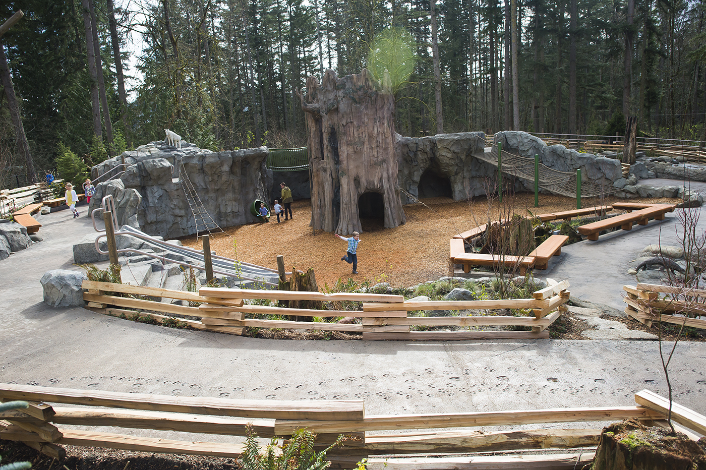 Northwest Trek even found a use for diseased trees from its 435-acre free-roaming area: a local mill turned them into the 60 benches that line the playground. Root wads were also collected and reinforced with shotcrete to form a root wad cave for kids to explore.