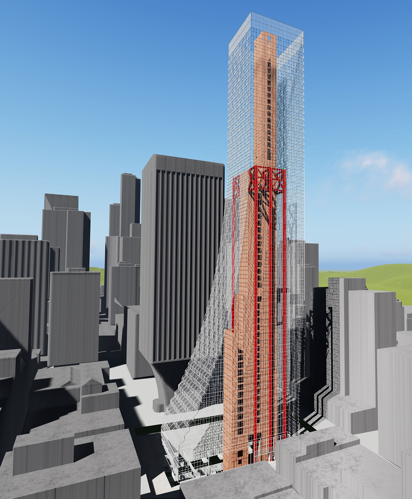 This is the first use of this new system, called Concrete-filled, Composite Plate Shear Wall (CF-CPSW) core, in the United States in a high-rise building, and the first in the world in a high seismic zone.