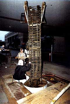 The project was a seismic retrofit and upgrade of the J-Wing birthing/intensive care units, as well as a seismic upgrade of the sky bridge that crosses from J-Wing to L-Wing. The $930,000 job consisted of constructing three concrete shear walls in occupied patient rooms of the ICU unit, with tie-in to the structure of the cancer ward above. While the actual patient rooms themselves were vacated during construction, all the surrounding areas were occupied and functional. The concrete shear walls were a challenge because the job required concrete to be pumped into an occupied ICU — without using any interior stairways or chases. The solution was to remove exterior windows and pump the concrete up four floors. Epoxy column wraps were installed on three existing concrete columns spanning two floors. In addition, eight 30-inch-diameter columns, extending 50 feet below street level, were installed to support two 75-foot-long wide-flange beams. The beams in turn supported the under side of the sky bridge. Negative air machines were used during the epoxy curing stage to exhaust the fumes. Care was taken to coordinate the location of the exhaust so as to not re-introduce the odors into adjacent air intakes. The project’s greatest challenge was penetrating the occupied space below street level to build three auger-cast columns. Drilling had to be coordinated during off-shift hours. In addition, intense water control methods had to be used to insure that there was no disruption to the hospital’s activities below the work. Construction personnel received critical training in hospital procedures and protocol in order to ensure the safety of patients, hospital staff and fellow workers. The project was originally intended to span six months. It was finished 45 days early with no injuries or recorded accidents. |