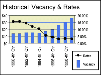 The wave of rising rents leaves behind whitecaps of despair for the prospective or renewing tenant sent reeling by rental sticker shock. Rents have climbed so quickly during the past four years that it is hard to remember when this new cycle started. Tenants have seen their rents double with little or no concessions being offered by non-sympathetic landlords. Office buildings outside the central business district are obtaining full service rents in the low to high $30s. A decade ago rents were closer to $12 to $14 in the same peripheral markets. As for the central business district, the $16 "effective" rental rate negotiated in the mid-rise section of Two Union Square a decade ago is now in the mid to high $30s. Rents have risen above the $40 range for the prime high-rise spaces and have the potential to continue to rise if and when the space comes available. The then typical $35 to $40 "turnkey improvement package" on newly constructed space is now effectively closer to $20 or less. The shell and core level finishes provided by the landlords are quite thin in comparison to what was provided during the 80s and early 90s. As much as $9 to $12 of a tenant improvement allowance can be eaten up in above ceiling costs, such as getting the HVAC distributed and electricity to the space, the lighting fixtures, ceiling grid, tiles and exterior mini-blinds purchased and installed. Tenants are now routinely paying out of their own pockets to fund additional required improvement costs. Landlords also do not have to amortize these extra costs, a common practice in the 80s and early 90s. For a clear perspective of the market statistics illustrating how the market has changed over the last decade, take a look at the accompanying graph. We’ve had our share of ups and downs. The drama unfolds. When I began my brokerage career in 1985 it was an exciting time to be in commercial real estate. The entire Puget Sound real estate community was teeming with confidence. Business journals read more like industry trade magazines covering the next high-profile real estate project on the horizon. High-profile developers, such as Martin Selig, Wright Runstad and Unico Properties, ruled over downtown Seattle. The names Mike Mastro, Basil Vysis, Lang Sly, Tom Bernard and Koll Development Co., were synonymous with Eastside development. Each new project seemed to be designed to upstage the preceding in grandness of scale. Imported marble and granite finishes, rare rain-forest hardwoods and ornate glass sculptures graced building lobbies and restrooms. The Seattle real estate "golden age" was blossoming and office space was "visualized" to reality. The Puget Sound region was beginning to emerge onto the national and international stage thanks in part to Boeing and a budding software company called Microsoft. The business climate was ripe for development along with available land, over abundant investment capital and the vision and talent of local, ardent developers. The supply for office space grew as quickly as the capital it attracted. And the plot thickened. Although we were seeing absorption rates in the seven-digit figures in the late 80s, the amount of new space being introduced into the market was coming on-line at a monstrous pace. A pace so fierce that it spurned a region wide successful grassroots anti-growth campaign. Ironically, a subsequent "Cap" initiative enacted in Seattle expedited the construction of more than 3 million square feet due to the threat of a significant suspension of existing permitted projects. This was clearly not in everyone’s best interest. Unfortunately for those invested in commercial real estate, either financially or by career choice, the national recession had finally reached Seattle. The seemingly limitless capital markets dried up and the US went to war with Iraq. This put many business decisions on hold and the demand for office space, in contrast to the vast supply of office space, was at a pace that resembled molasses on a cold winter’s morning. Vacancies reached a record high in 1989 with the completion of Two Union Square and Pacific First Centre (now the US Bank Centre). This was further increased by the completion of AT&T Gateway Tower in 1990 (now known as Key Tower and soon to be known as City Hall).