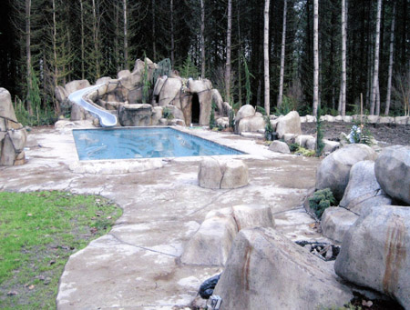 Photo courtesy of Cadman A 35-foot-long water slide runs down a shotcrete mountain into this Carnation swimming pool.