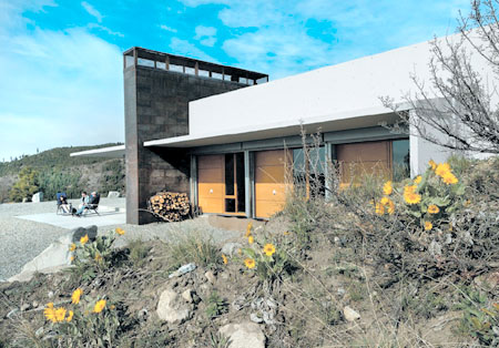 Nighthawk Retreat is a V-shaped concrete shell notched into a remote, south-facing mountain ridge. The owners wanted a vacation retreat offering seclusion and connection to the natural environment. The site is off the grid, so solar electrical generation and energy conservation were critical to the success of the project. The roof structure is composed of a 12-inch-thick one-way slab that spans 20 feet and is designed to support up to 4 feet of soil and snow loads of up to 136 pounds per square foot. To contain the rooftop soil, a 5-foot-tall retaining wall was designed near the front of the building, aligning with steel support columns below. Twelve-inch-thick earth-side walls provide retaining, gravity support for the roof and lateral force resistance. Concrete foundations are conventional strip footings combined with a reinforced concrete slab on grade. A large double-wall central fireplace structure acts as a shear wall. Using concrete as the chief material for the roof and retaining walls allowed the house to be an earth-sheltered, passive solar design that offers insulation in the winter and cave-like cooling in the summer. The house relies on the use of concrete as finish material for both its exterior and interior. The underside of the roof slab is exposed as the finished ceiling, and the roof slab, which cantilevers out 7 feet, tapers to 6 inches at the end, providing a visually thin finished edge. Set over the slab on grade and separated by a layer of insulation is a concrete topping slab with hydronic radiant heating, which serves as the finished floor.