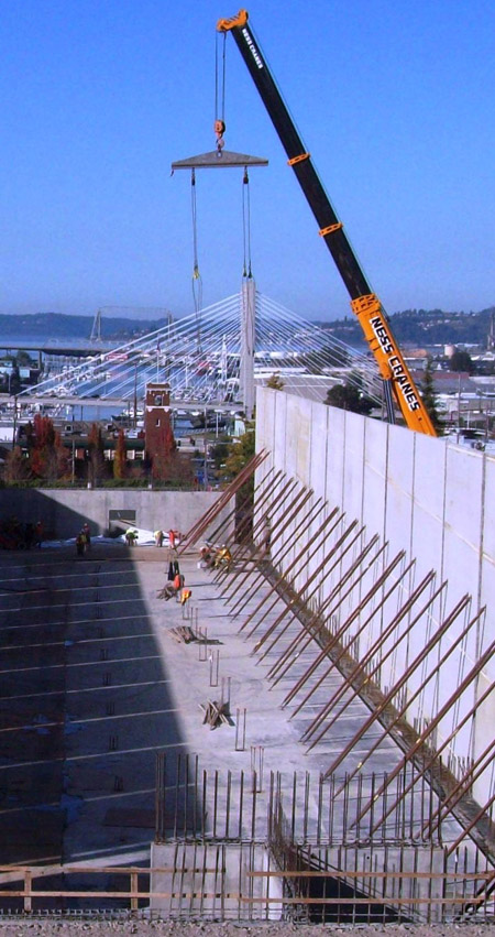 LeMay – America’s Car Museum, set to open on June 2, is both a vintage car museum and a parking garage. The building houses the museum’s administrative offices, banquet facilities, gallery spaces, retail and storage for the collection of vintage cars. Its structure consists of concrete tilt-up walls with cast-in-place concrete ramps and elevated decks for the cars. The heavy timber roof structure, supported by interior concrete columns, has 5-foot-deep glu-lam arches that span 100 feet and are wrapped by a curved standing seam aluminum roof. Concrete work required various mixes totaling over 9,400 cubic yards, including a four-level, ramped cast-in-place display/storage facility with showroom space on the upper level. The entire structure is enclosed with exposed site-cast tilt-up concrete panels. The concrete subcontractor worked closely with the general contractor and the owner’s design team in the value engineering stages, including the idea to convert the perimeter walls to tilt-up concrete. Using tilt-up concrete saved time and money, and gave the museum a distinct architectural look. All the panels were erected in one day. Structural ramps and slabs were mostly done in the winter, calling for hot water and non-chloride accelerators as well as protection with insulating curing blankets.