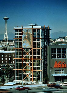 The REI project had three primary objectives: cost, aesthetics and environment. Concrete was selected to fulfil those requirements -- from the building's cast-in-place walls, columns and post-tensioned decks to its shotcreted climbing pinnacle.