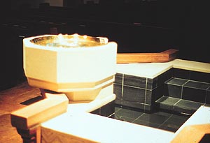 All components for the concrete mix were hand-loaded in a mixer truck. During placement, the contractor used five-gallon buckets to carry the concrete into the church, up a flight of stairs and into the sanctuary. Concrete was then poured into intricate forms and a vibrator was used to eliminate any rock pockets. After the forms were removed, some sandblasting was done to expose the colored rock in the railing surrounding the base of the font.