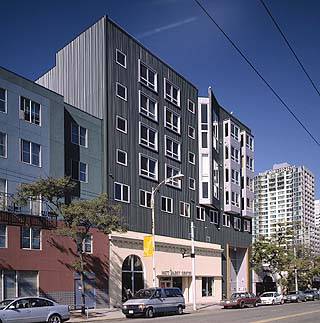 Rafn Co. exceeded community expectations by pursuing LEED certification for this low-income apartment project in Seattle’s Belltown neighborhood. Traugott Terrace was financed through a combination of federal low-income housing tax credits, Washington State Housing Trust Fund monies and Seattle Office of Housing funding. Providing 50 units of low-income housing for individuals recovering from homelessness and substance abuse, Traugott Terrace was built in two sections, one 3,077-square-foot footprint above the existing Matt Talbot Center and the other 3,200-square-foot space on its adjacent parking lot. A challenge was welding the steel structure pedestal, which is the base for the second-story apartments, over wood frame. That hazardous procedure was complicated by limited fresh air for workers. The project was designed to the standards of the Seattle City Light Built Smart program, and more sustainable strategies were developed when funds from the citys LEED Pilot Incentive Program became available. Rafn used energy-saving strategies and value engineering to deliver a cost-effective, sustainable product that was completed with minimal disturbance to the surrounding urban community. Sustainable elements include: building the units around an outdoor deck to maximize access to natural light and ventilation; upgrading to sustainable materials including switching from sheet vinyl flooring to linoleum tile; installing Euroline commercial-quality windows; and substituting a gearless traction elevator for a hydraulic variety; and choosing water-conserving plumbing fixtures such as low-flow faucets and showerheads and efficient front-loading washing machines. The project team included: Swenson Say Faget, engineer; and ABC members Village Framers Corp., DeBolte Plumbing & Heating, Ralph’s Concrete Pumping, Commercial Welding & Fabrication, and Matheus Lumber Co. |