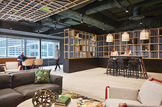 Gensler created a giant living room for employees and guests at the Gusto headquarters in San Francisco. The historic building was retrofitted by Wong Logan Architects.