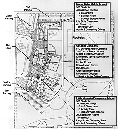 Little Mountain Elementary and Mount Baker Middle Schools are the first all-new schools the District has built since 1987. The District "backed into" the shared facilities concept for these schools because it was able to secure only a single site. The District already had a very successful student tutoring program in which middle school students went back to their old elementaries. This experience argued for locating the schools close together. There also seemed to be an advantage in building one large library rather than two smaller ones. Because a kitchen is some the most expensive space in a school, it made sense to build one, not two.
