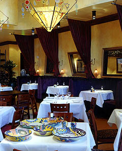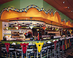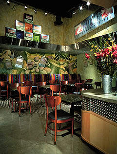 Broken tile glazed in bright red and other hot colors dominates the interior, and glass art objects complete the scene. This is a Wolfgang Puck Cafe calmed down for the local market.