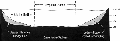 To locate the areas that may require sediment remediation, the committee has conducted extensive sampling and analysis in Hylebos Waterway over the past two years. Results to date show that the waterway is considerably cleaner than it was in the mid-1980s and that the volume of sediment that may require remediation is far less than originally estimated. Surprisingly, the data also show that certain impacts to sediment dwelling organisms are not due to hazardous chemicals as was previously assumed. Instead, typical waterway activities, including prop wash from ship traffic, organic debris from the movement and storage of log rafts en route to the saw mills and log ships, and shoreline protection structures (riprap) adversely effect marine organisms that typically live in subtidal sediments. One of the challenges facing the HCC is to perform the pre-remedial design program in a technically sound manner that remains cost-effective. A conceptual model was developed to remap the "subtidal surface" and aid in selecting where to sample sediments. The subtidal surface is the top few inches of the bed of the waterway which is located deeper than the mean lower low water (MLLW) level. Using the model, locations and amounts of sediments that have accumulated in the waterway since it was last dredged were determined by comparing recent waterway topography to the oldest recorded topography for the entire waterway. The resulting map (see attached hypothetical figure) shows where sediment has actually accumulated in the waterway during the time of industrial discharges. This map allowed the HCC to focus sediment sampling on areas where contaminated sediment is most likely to be found and cut the required sampling to about half. To date, the HCC has gathered sediment quality data at 85 subtidal stations. (The HCC generated data for 57 stations and received data from the Natural Resource Trustees for the other 28 locations.) Fifty stations (59 percent of the total) show chemical concentrations that exceed ecological sediment quality objectives (SQO), the chemical criteria used to identify sediments requiring cleanup based on protection of the biological community. Under the Record of Decision, biological testing can be used to overrule the sediment chemistry results for chemicals that can cause ecological impacts. Of the 50 stations that exceed allowable contentrations, biological results are available for 28 stations. Only 17 stations exceed biological criteria, and these stations are concentrated at the mouth of the waterway or scattered at isolated locations within the middle and upper portions of the waterway. The biological results reduce the size of cleanup by as much as 25 percent to 50 percent compared to the volume predicted by chemical criteria, and show that chemical testing alone is not a 100 percent effective predictor of contaminated sediment. The use of direct biological testing along with consideration of areas affected by prop wash and organic debris is the best approach for identifying contaminated Hylebos sediments that would actually benefit from remediation. In addition to defining the extent of chemicals in the waterway, the cleanup committee's studies also show large amounts of organic material in the upper half of the waterway. This organic material appears to be wood debris from historic sources and/or current transport and storage of logs for the saw mills and log yards located along the upper half of the waterway. This commercial activity has resulted in organic loading to the sediment which has caused alterations to the marine habitat. It also appears to have caused the sediment to become toxic to some marine organisms.